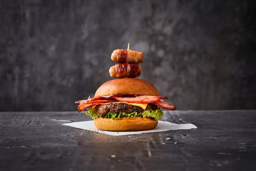 nice buns Burger Vibes Thick Cut Bacon, with American cheese, lettuce, and ketchup on a brioche bun, topped with hand-wrapped Pigs in Blankets. Related Products