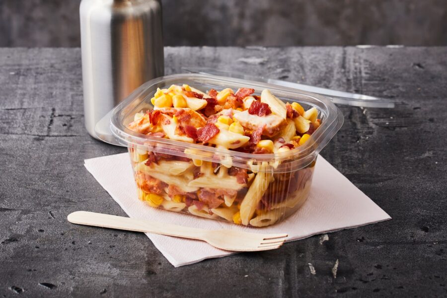 Ready to go Simply Satisfying Simple, satisfying, and ready to go, try sliced cooked chicken with our diced bacon with penne pasta in a simple sweetcorn and mayo mix. Related Products