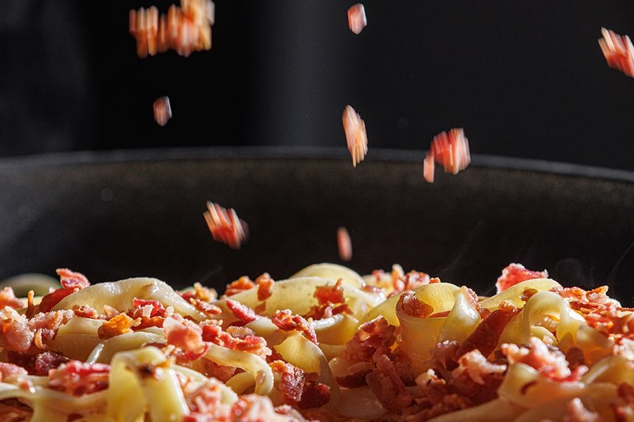 LUXURIOUSLY RICH Ultimate Comfort Food Our medium cook bacon pieces are the perfection addition to any carbonara- tossed in egg, cream, garlic, and cheese, served with freshly made tagliatelle. Related Products